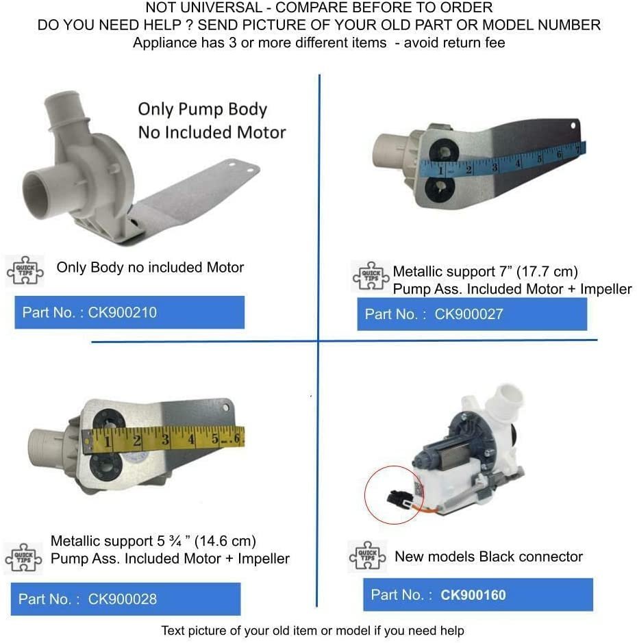 GLOB PRO SOLUTIONS 175D3834P008 2754597 CKD1383 Washer Drain Pump Assembly Black 5 " ¾ large Approx. Metallic Support Replacement for and compatible with General Electric Hotpoint Heavy DUTY Glob Pro Solutions register brand in process- Amazon don’t allow sell similar ***** Check options categorized by measures o connectors, this product have different numbers of parts . ***If you need faster see other options in check out,The part has 20 different part numbers like: 175D3834P008 2754597 if you have old serial number, the new part has new number and looks different of your old part but the new part is perfect fit for old and new serials GBAN2800F0WW, GCAP1800D0WW (), GCAP1800D1WW, GCWN2800D0WW (), GCWN2800D1WW, GCWN2800D2WW, GCWN4950D0WS (), GCWN4950D1WS, GCWN4950D2WS, GCWN5550D0WW (), GCWP1800D0WW (), GCWP1805D0CC (), GCWP1805D1CC, GHWN4250D0WW (), GHWN4250D1WW, GHWN4250D2WW, GHWN5250D0WS (), GHWN5250D1WS, GLWN2800D0WS (), GLWN2800D1WS, GLWN2800D2WS, GLWN5250D0WW (), GLWN5250D1WW, GLWN5550D0WW (), GLWN5550D1WW, GMAN2800D0WS (), GMAN2800D1WS, GMAN2800D2WS, GMAN4250F0WS, GMAN4250F1WS, GMAN4250F2WS, and more.*****This part is perfect fit, you don’t need additional wire cables, terminal or glue, easy job 15 minutes average time, NON OEM Universal Replacement Part with OEM standards, replacement for and compatible with True, Beverage Air, Plased, Tecumseh, RCA, Estate Whirlpool, Monogram, Maytag GE Kenmore Samsung, Frigidaire,Amana, LG Miele and more.. those brands are just used like illustration, Models